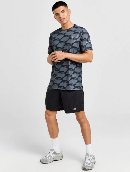 Push your performance in an eye-catching look with this men's All Over Print T-Shirt from New Balance. In a Grey and Black graphic print, this training tee is made from breathable and slightly stretchy polyester fabric, paired with NB Dry tech for cool comfort. Cut with a crew neckline and short sleeves, this top is finished off with reflective strips and a reflective NB badge. Machine washable. | Our model is 6'0" with a 36" chest and wears a size medium.